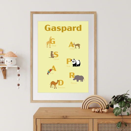 Affiche prénom personnalisée – Animaux & couleurs au choix
